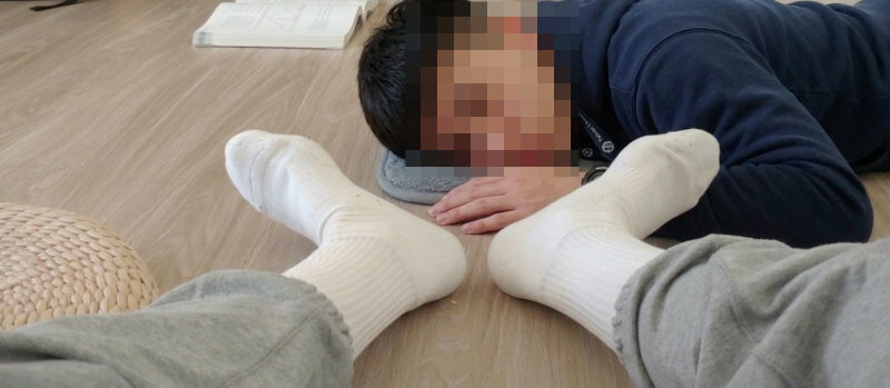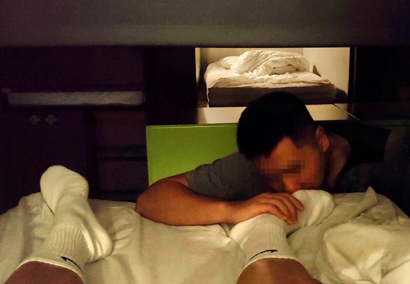 大約早上八點左右D床不分醒了,他說他要準備出門,他有續住,所以東西整理一下,簾子拉下來背個背包就出門去了。我想說去洗個澡,下床發現大家都穿白襪睡覺,A床有穿,B床也有穿,E床門蓮拉著看不到,F床門簾開著,網黃和朋友抱著睡,也都穿著白襪,G床Nike白襪哥本來就穿著白襪,H床和I床門簾拉著,J床沒穿,原來大家幾乎都喜歡白襪。