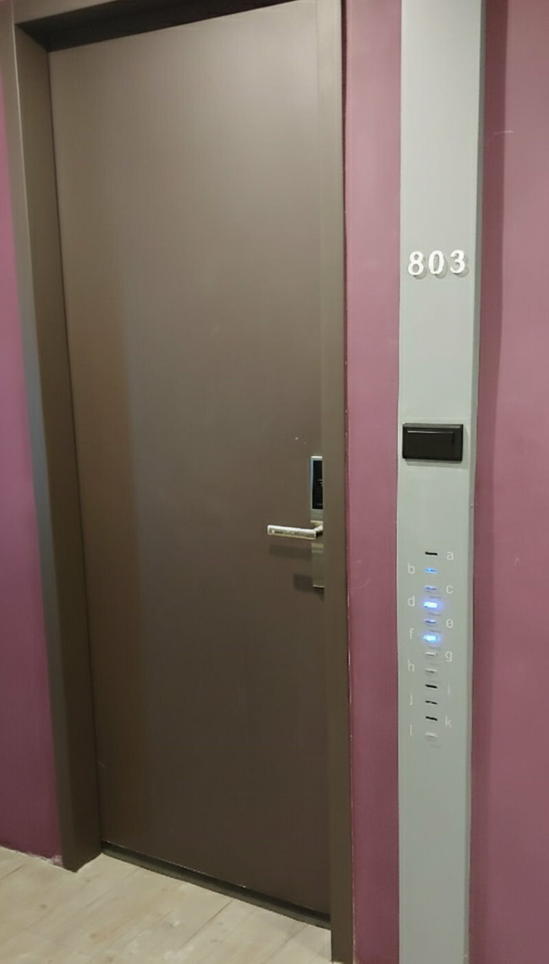 男生背包客房在七樓和八樓,每層樓的3號房都是最大間,也是人數最多的一間。其他房間有的只有4人、有的只有8人。換完拖鞋我就搭電梯前往我的房間,我今晚入住803C(上鋪)。我沒有特別指定,是旅店隨機幫我安排的。