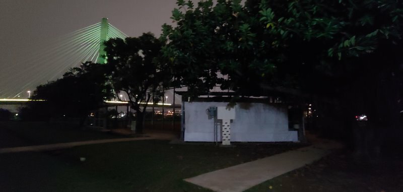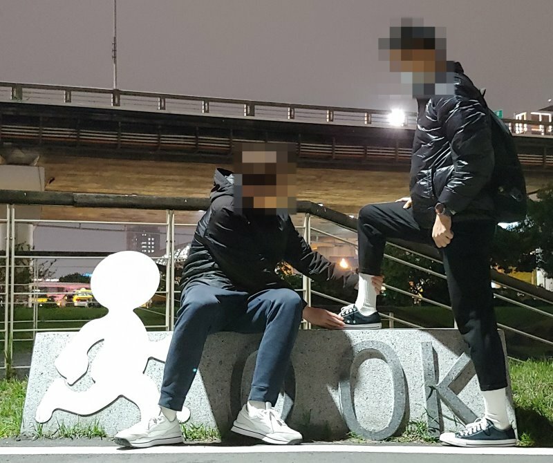 前來重新球場路上,完全無任何人經過,總覺得應該不會遇到什麼人,有預期會撲空的心理。雖然沒有燈光極為昏暗,但還能透過微微月光看到球場設施。我輕輕推開鐵柵欄,果然真的沒有人。於是心理開始暗竊的笑,等等回去就可以打臉網路上那些說很熱鬧的人。轉頭準備離開之際,突然有一個男生走進來,嚇我一跳。目測這位男生有180公分左右,體型壯碩,穿著黑外套與白鞋,尤其白鞋在黑暗中特別明顯。微光中可以稍微看見樣貌,長相帥氣,年齡約30上下左右。